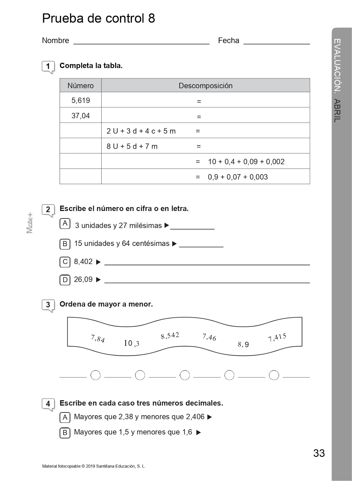 Esta prueba tiene el mismo valor que las fichas que me estáis mandando, no os pongáis nerviosos porque lo importante no es una nota, sino saber si habéis comprendido bien los números decimales.